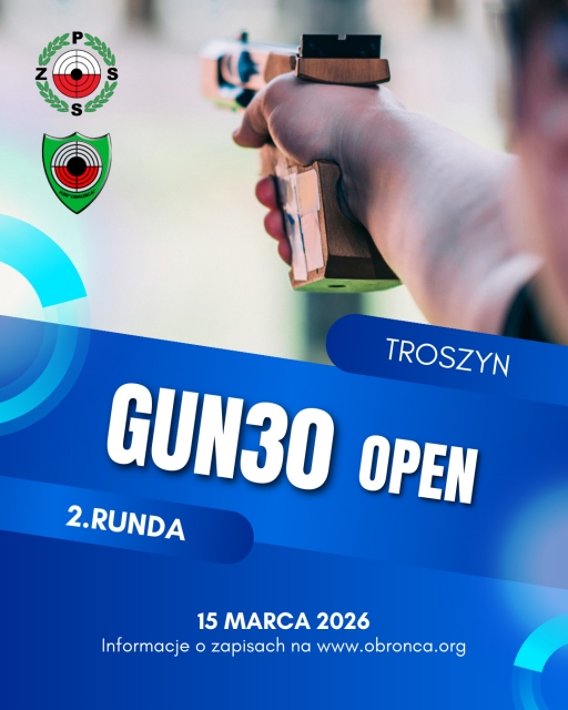 OBROŃCA GUN30 (open) - 2 runda w dniu 15 marca b.r. Konkurencja Psp30cz.d. - strzelanie wg przepisów ISSF z jednej ręki. Zawody ujęte w kalendarzu Polskiego Związku Strzelectwa Sportowego. Obecny Delegat Techniczny PZSS. Regulamin w zakładce "Zawody".