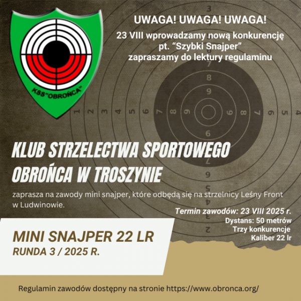 Zapraszamy do udziału w zawodach karabinowych p.n. "Mini Snajper 22 LR" - 3 runda, które przeprowadzimy w strzelnicy "LEŚNY FRONT" Ludwinowo w sobotę 23 sierpnia. Zawody prowadzone są w czterech edycjach w terminach: 26.04; 14.06; 23.08 i 13.09. Nagrody w każdej konkurencji z dnia zawodów oraz w klasyfikacji generalnej. Szczegółowy regulamin znajduje się w zakładce zawody na www.obronca.org